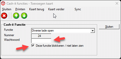 Sommige kassaknoppen zijn fraude gevoelig. Denk eens aan de functieknoppen [Lade open] en [Kas uit] knop. Je kunt functieknoppen beveiligen met een wachtwoord of helemaal uitschakelen via Cash-it menu [Cash-it functies].